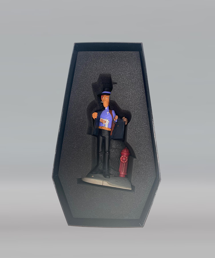 • Cette statue en résine de Soda, flic new-yorkais au double visage, a été éditée en 2004.